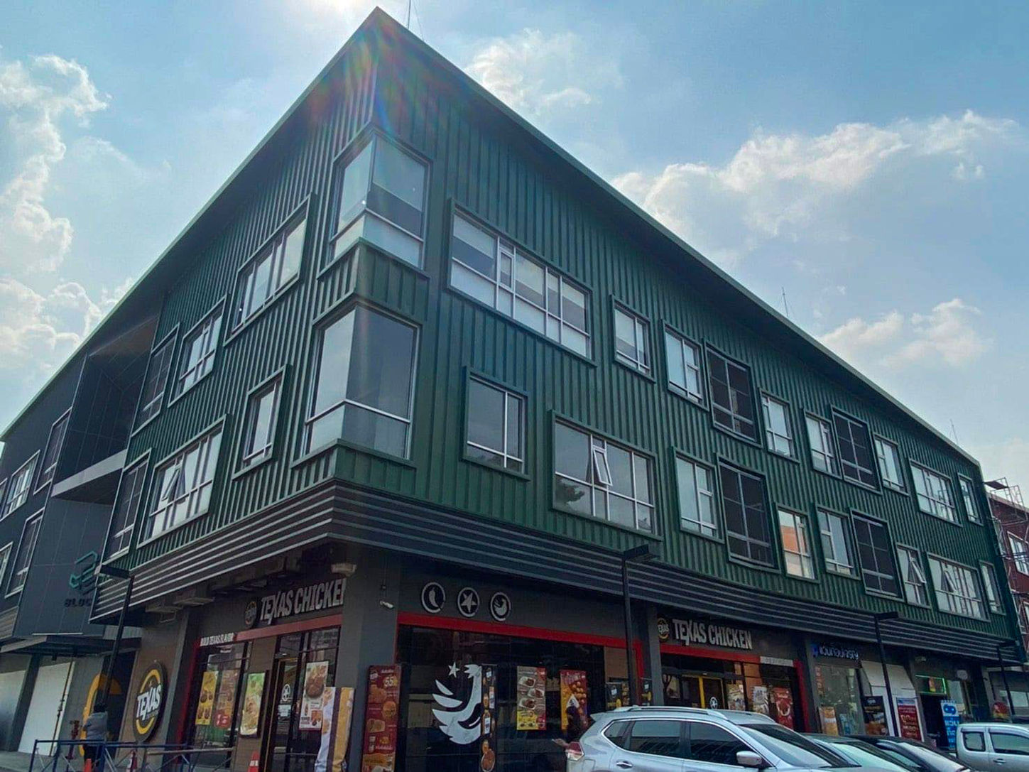 3 stories of mixed use 5 buildings, 424 car-parking spaces